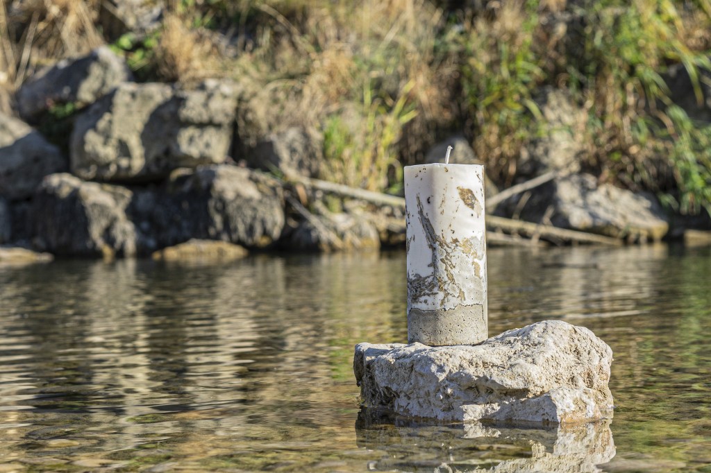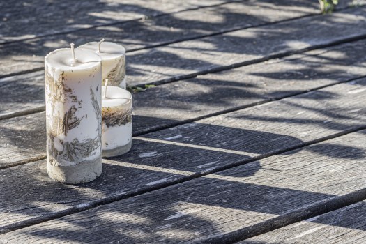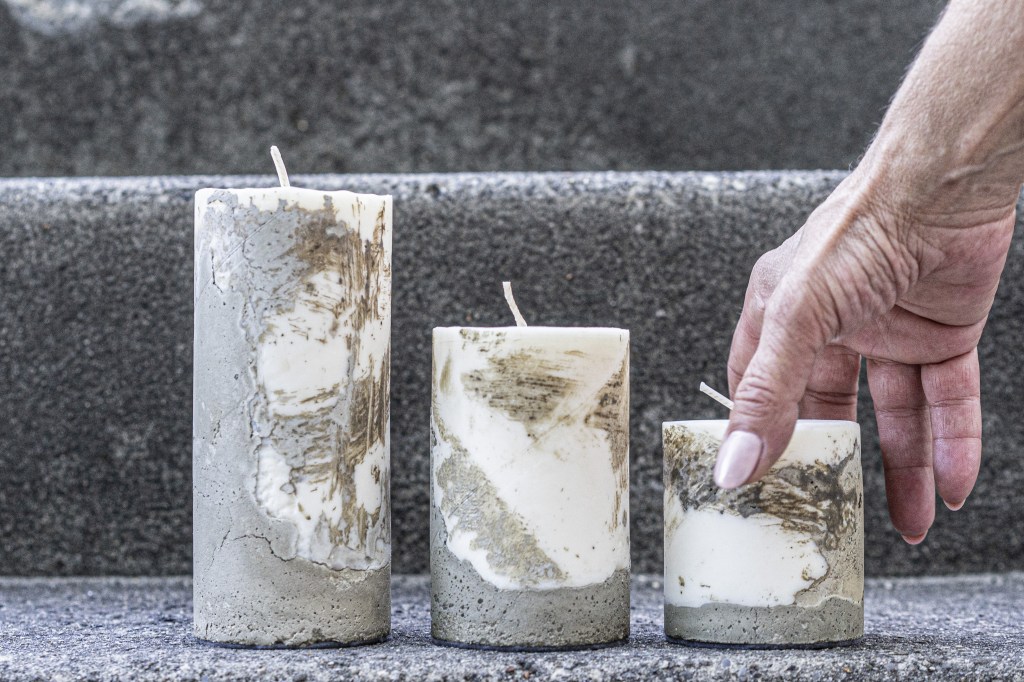 Les marbrures des bougies sont réalisées avec du ciment de construction et sont faites à la main, chaque bougie est unique et arbore ses propres dessins.