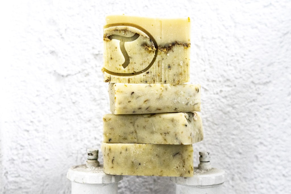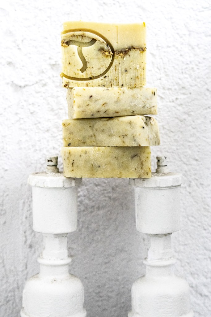 Huile d’olive extra vierge, huile de noix de coco*, huile de ricin*, huile de chanvre*, beurre de karité*, gel d’aloe vera pur*, huile d’amande, amidon de mais, huile essentielle de Ylang Ylang, menthe séchée, lavande séchée, eau, sucre, glycérine végétale, soude caustique, citrate de sodium.