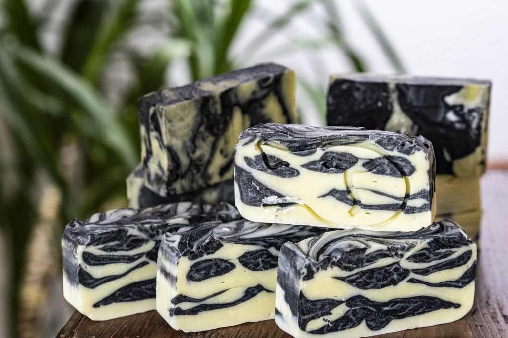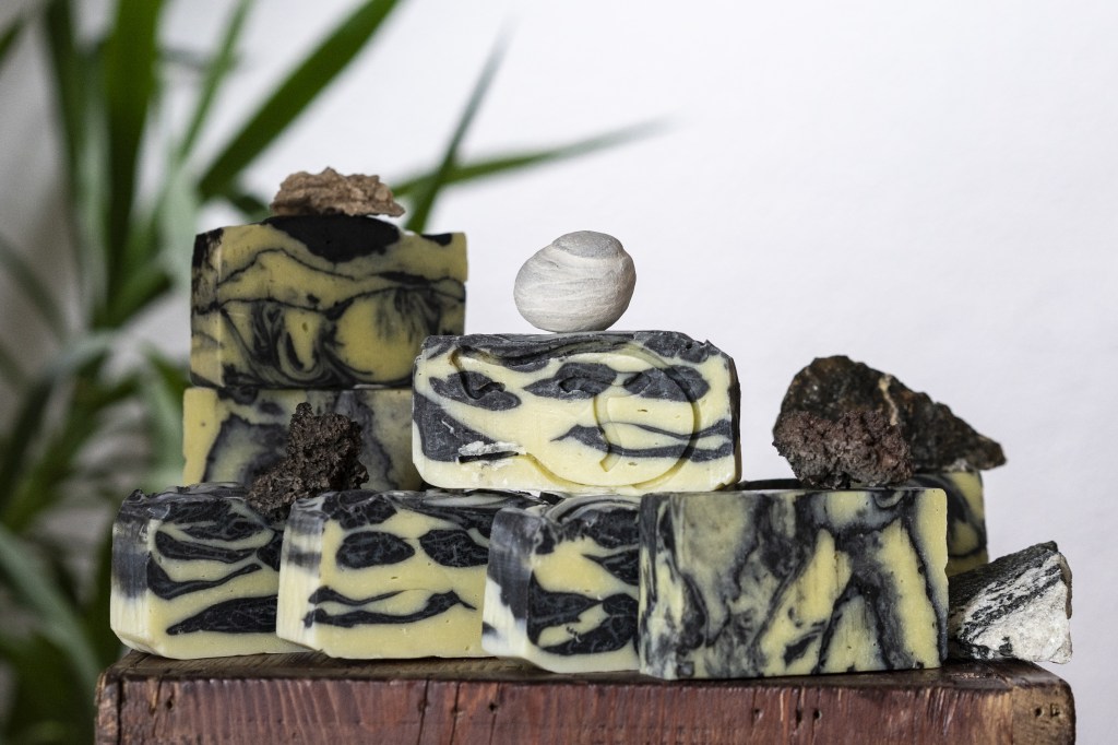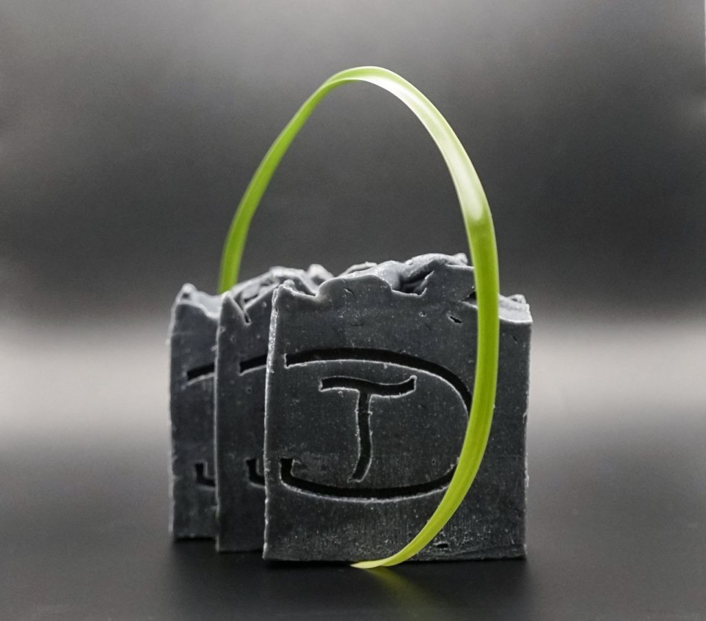 Huile d’olive extra vierge, huile de noix de coco*, huile de ricin, huile de chanvre*, huile d’avocat *, beurre de cacao*, charbon végétal*, eau, huile essentielle d’eucalyptus et menthe verte, sure, glycérine végétale, soude caustique, citrate de sodium.
