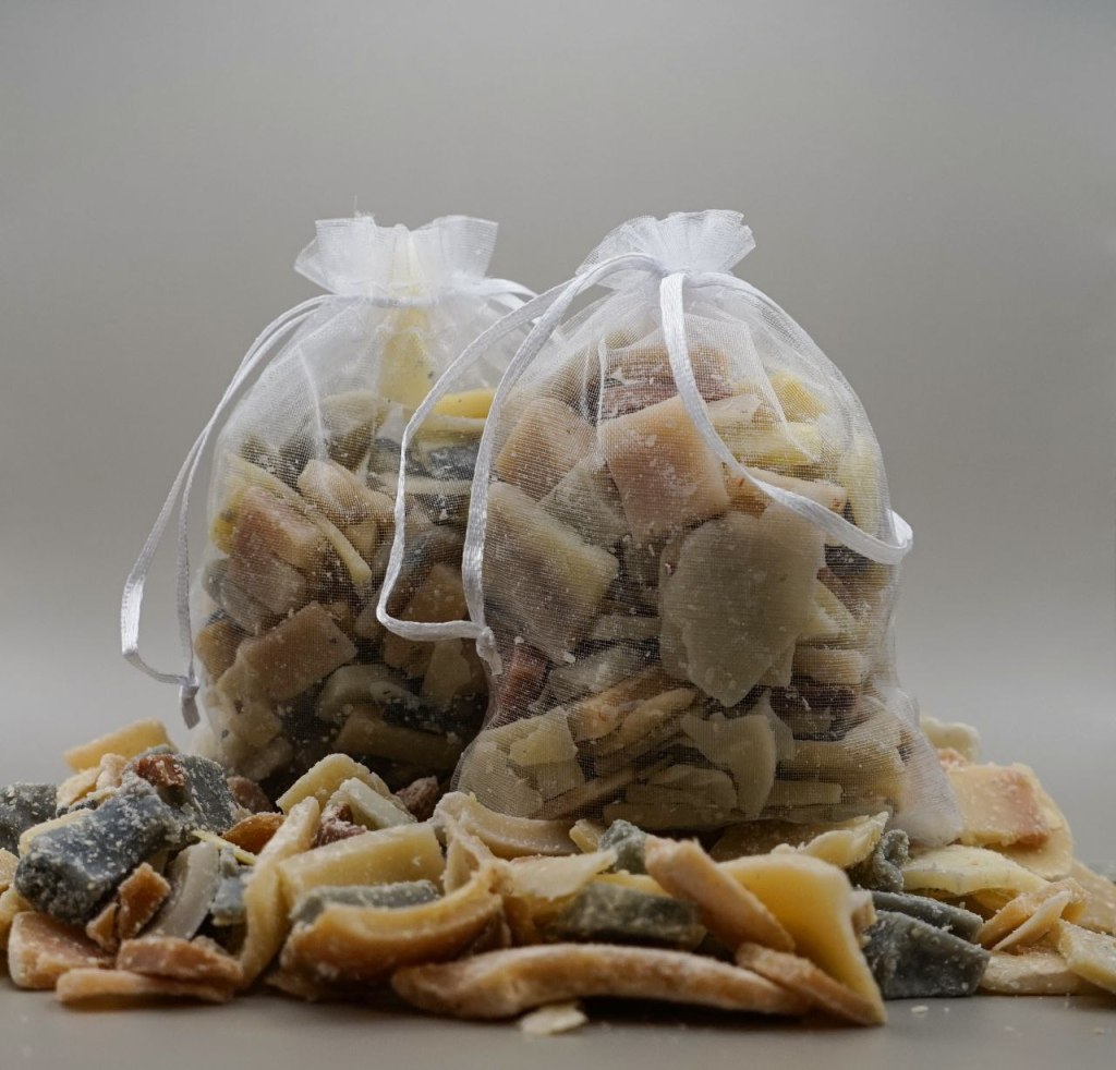 Un sachet de 100 grammes de chutes de tous les savons mélangés.